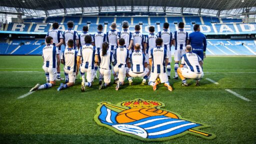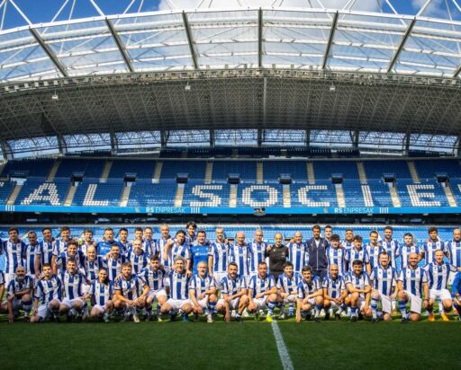 60 jugadores/as de diferentes empresas jugando un partido en el Reale Arena compartiendo equipo con sus ídolos de la Real Sociedad.